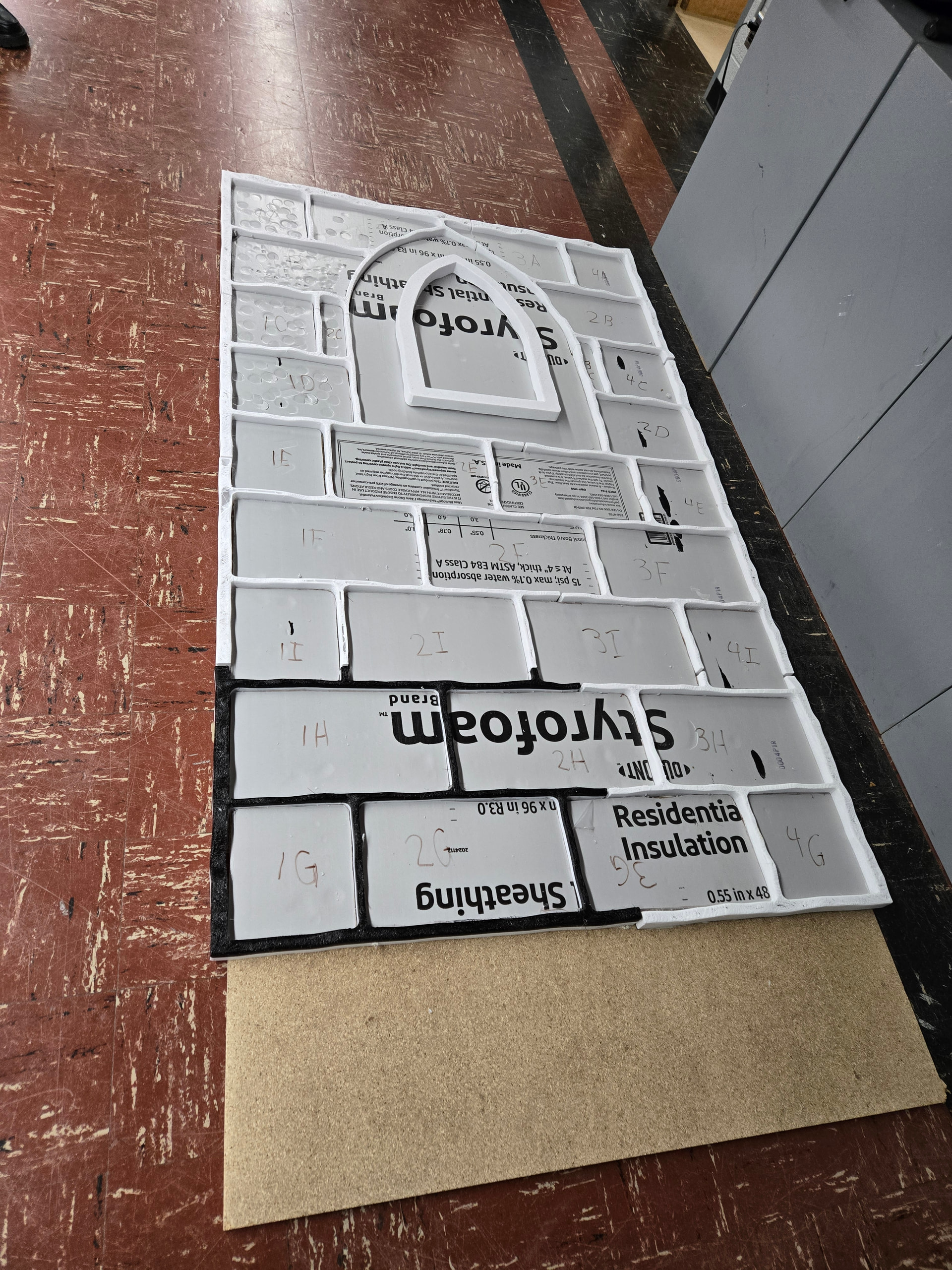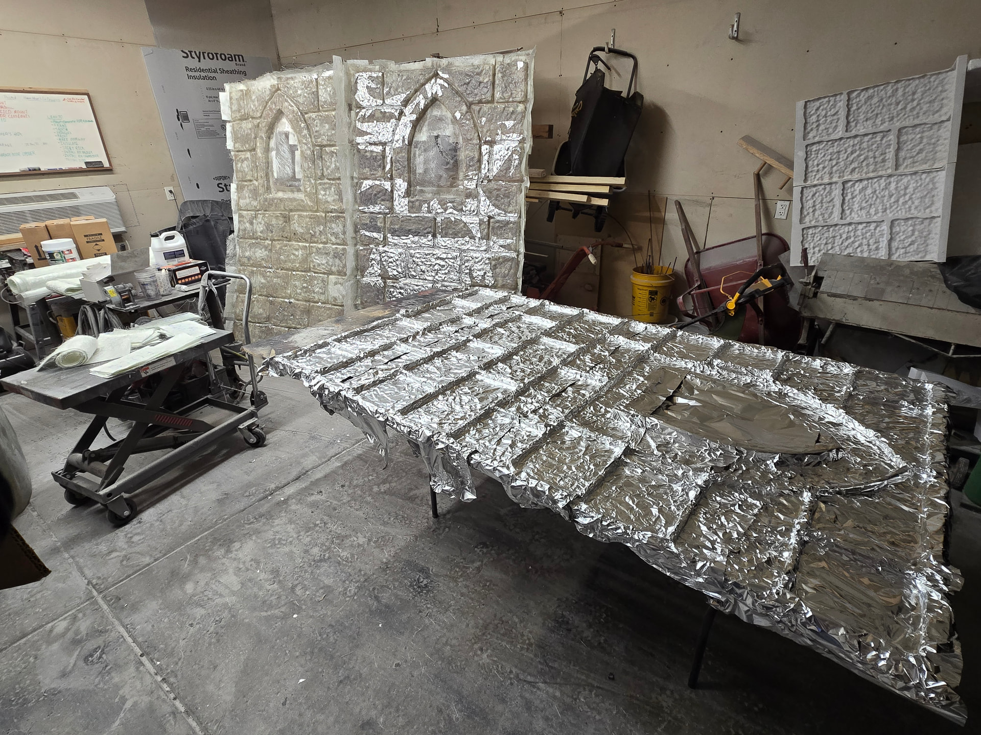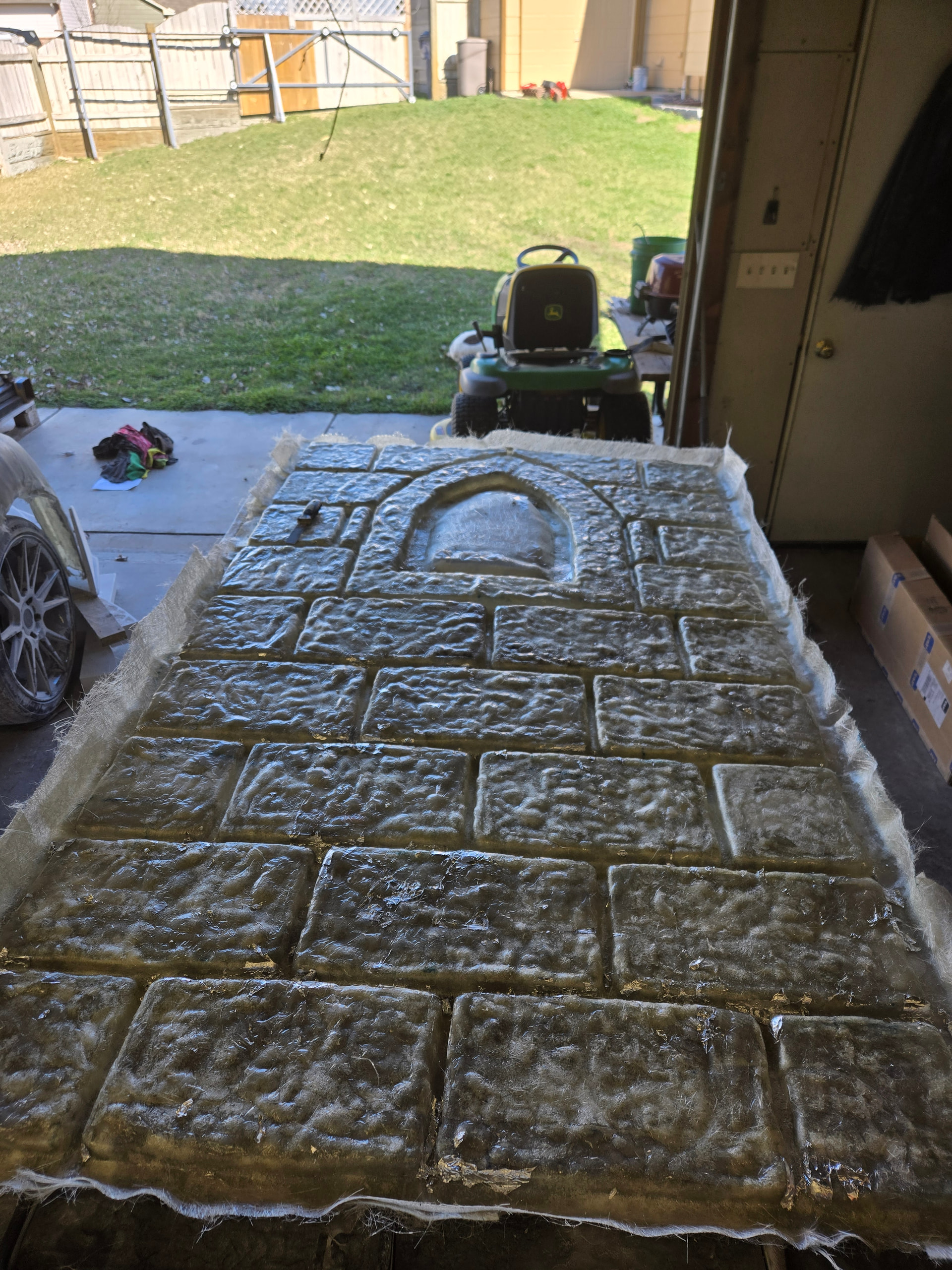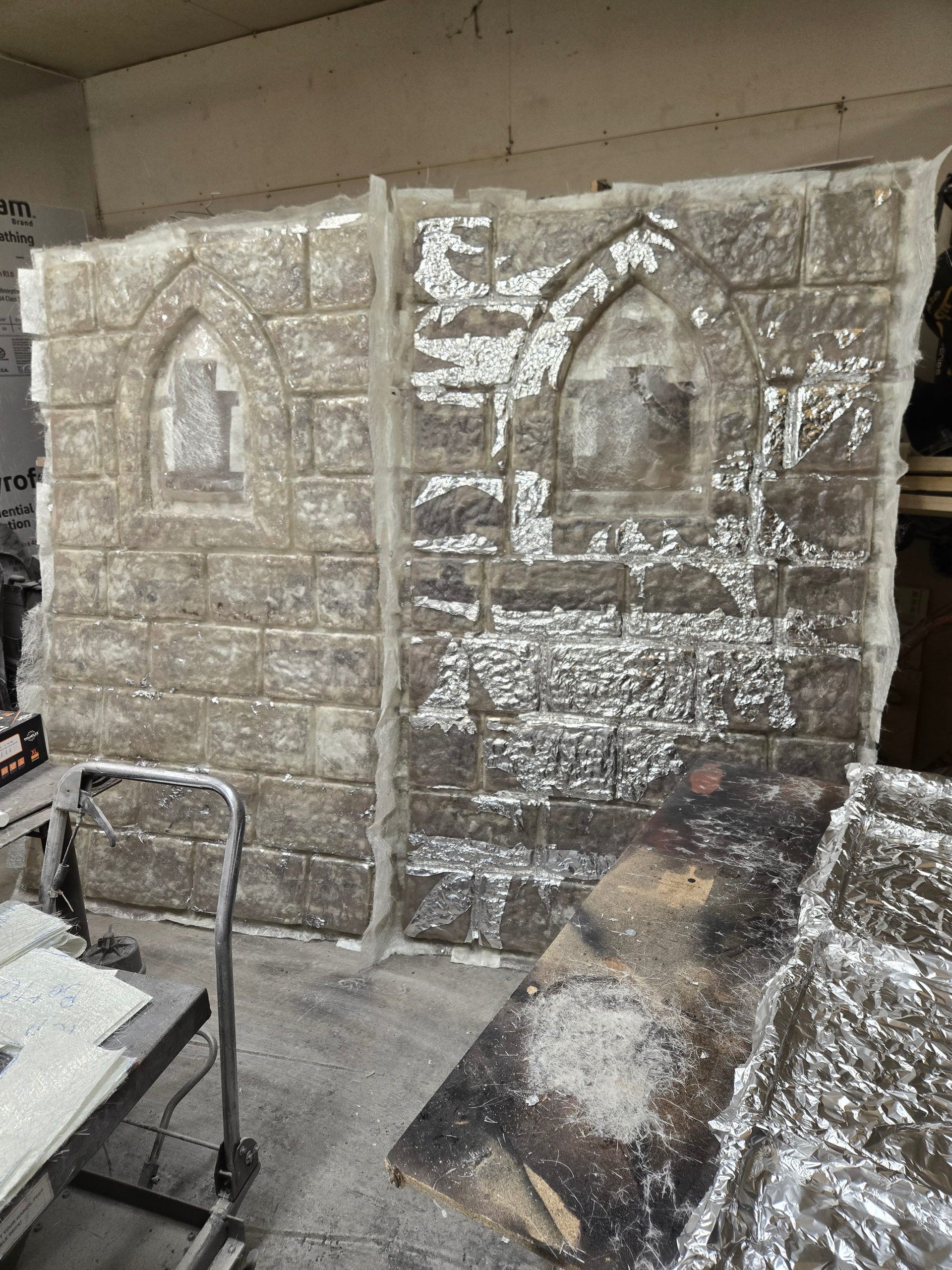 Made some progress, we’ll try to lay up the panel at noon tomorrow. Turns out a torch is a quick, but possibly toxic smelling way to turn Styrofoam into something that looks stone like.