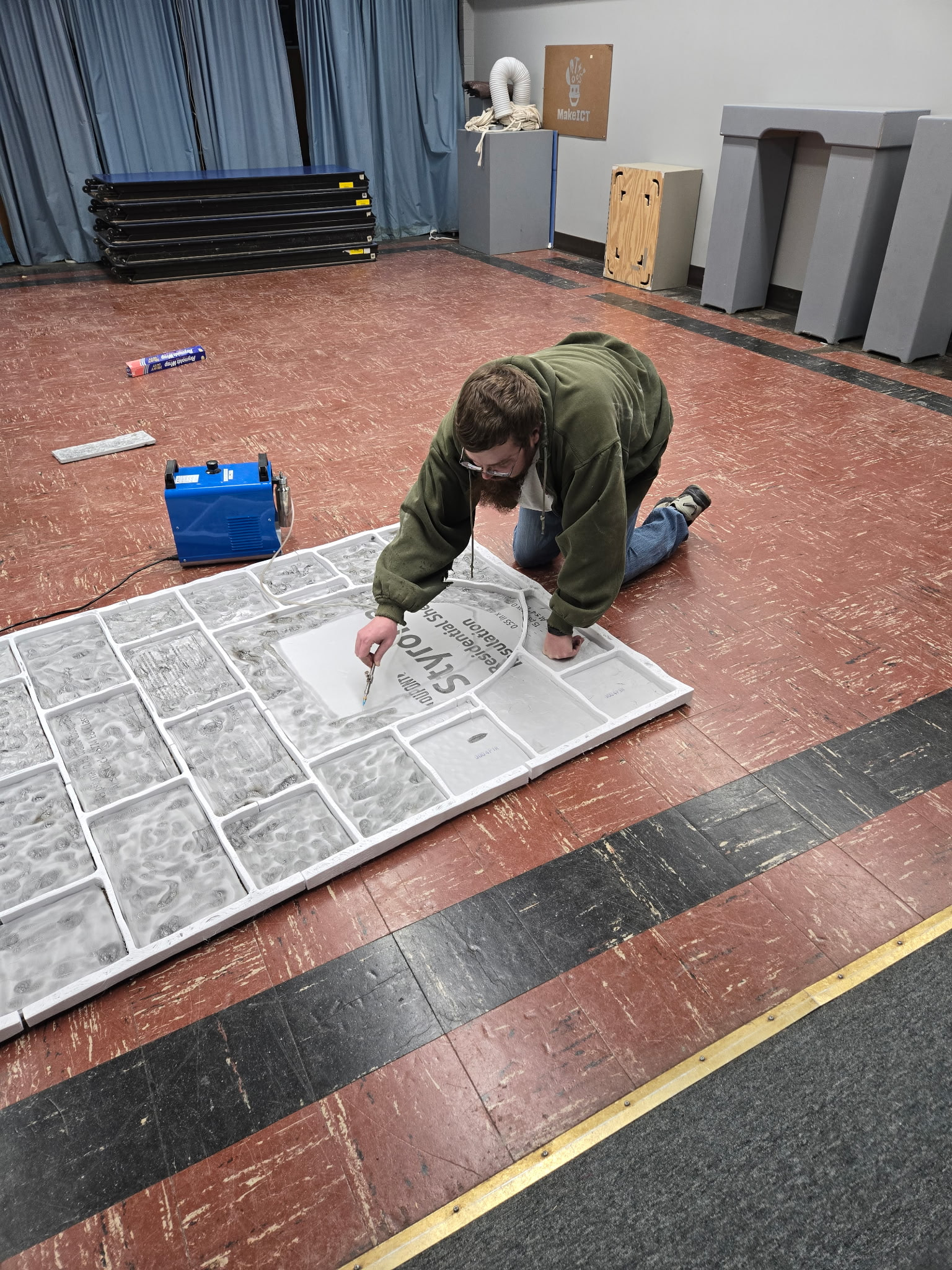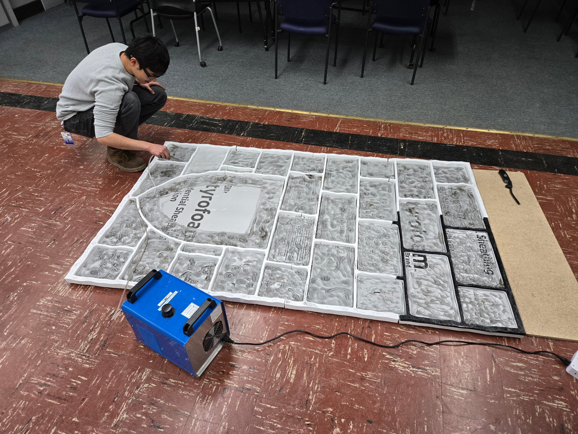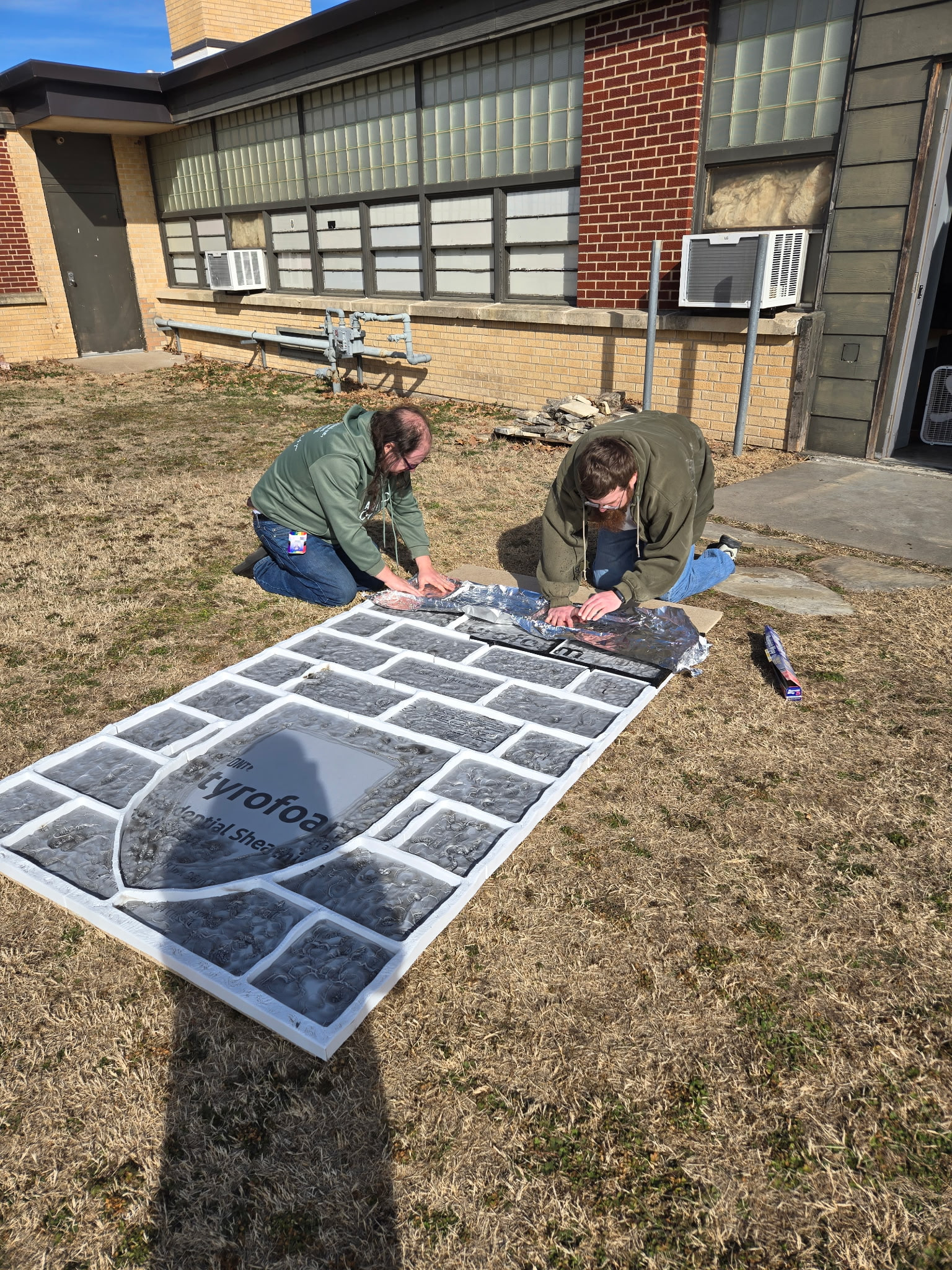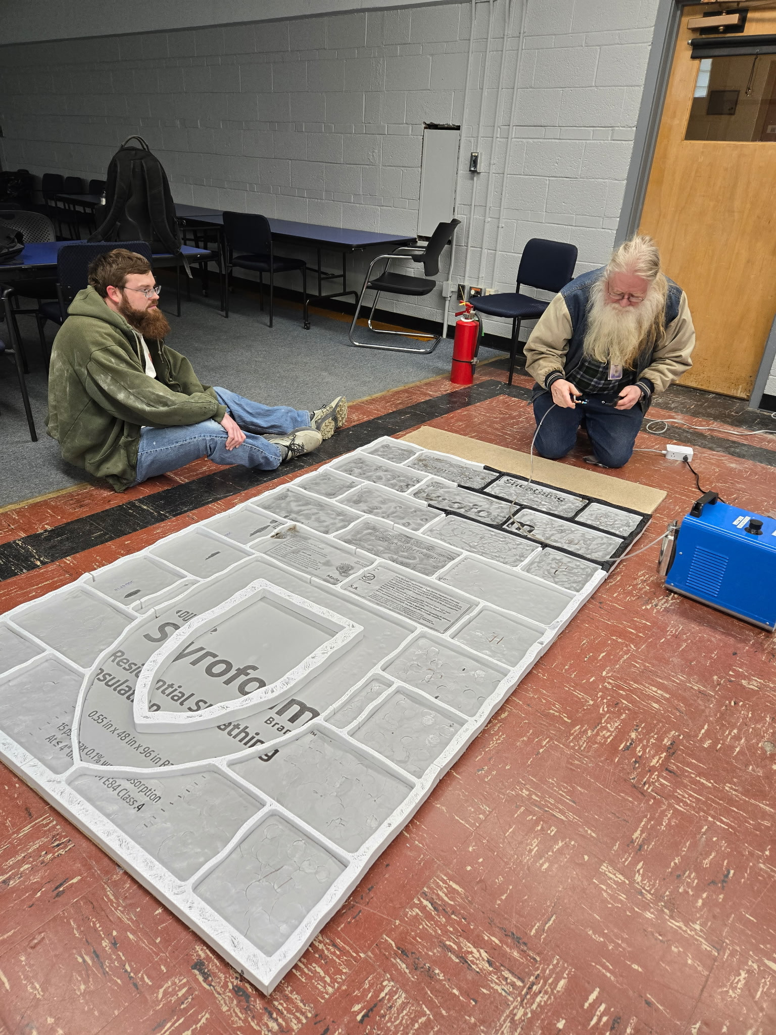 Made some progress, we’ll try to lay up the panel at noon tomorrow. Turns out a torch is a quick, but possibly toxic smelling way to turn Styrofoam into something that looks stone like.