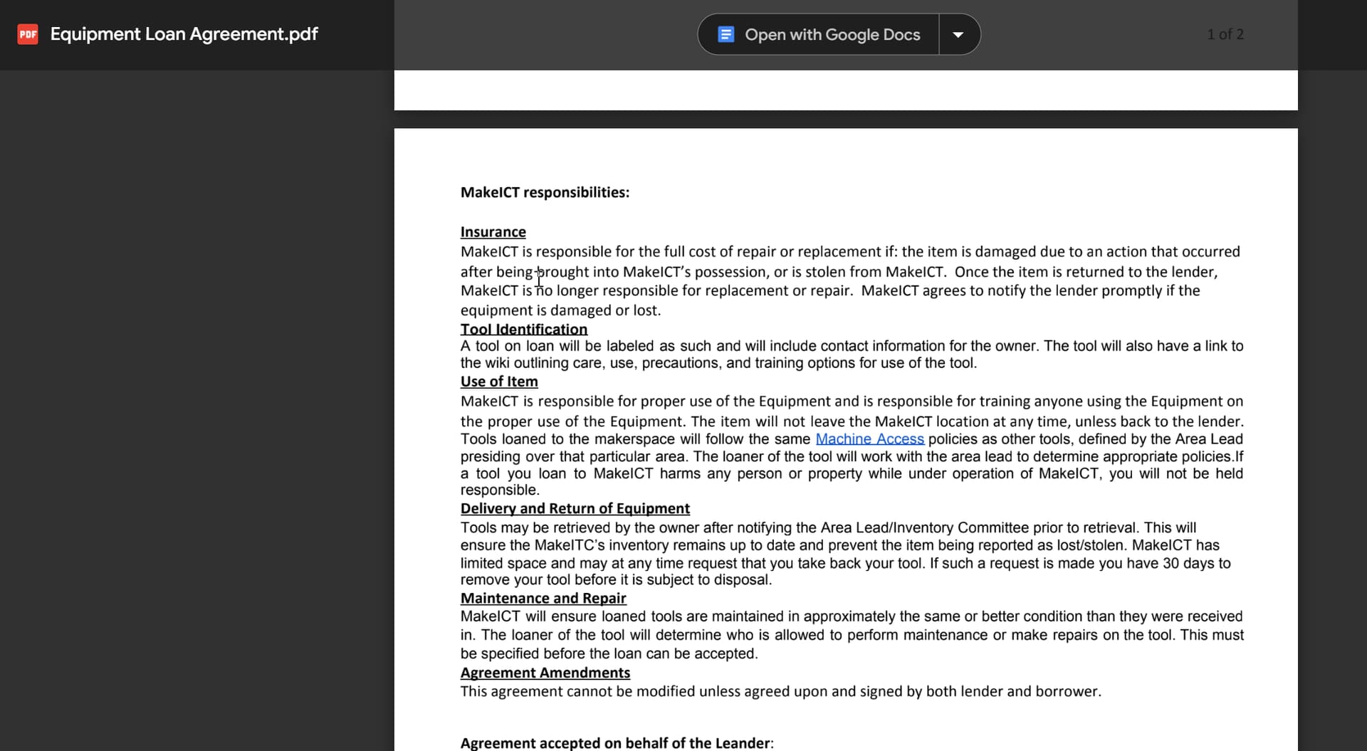 I think that the options for cooperative (or uncooperative) members should be counter-balanced against the obligations imposed on MakeICT, as described in the existing Equipment Loan Agreement form: