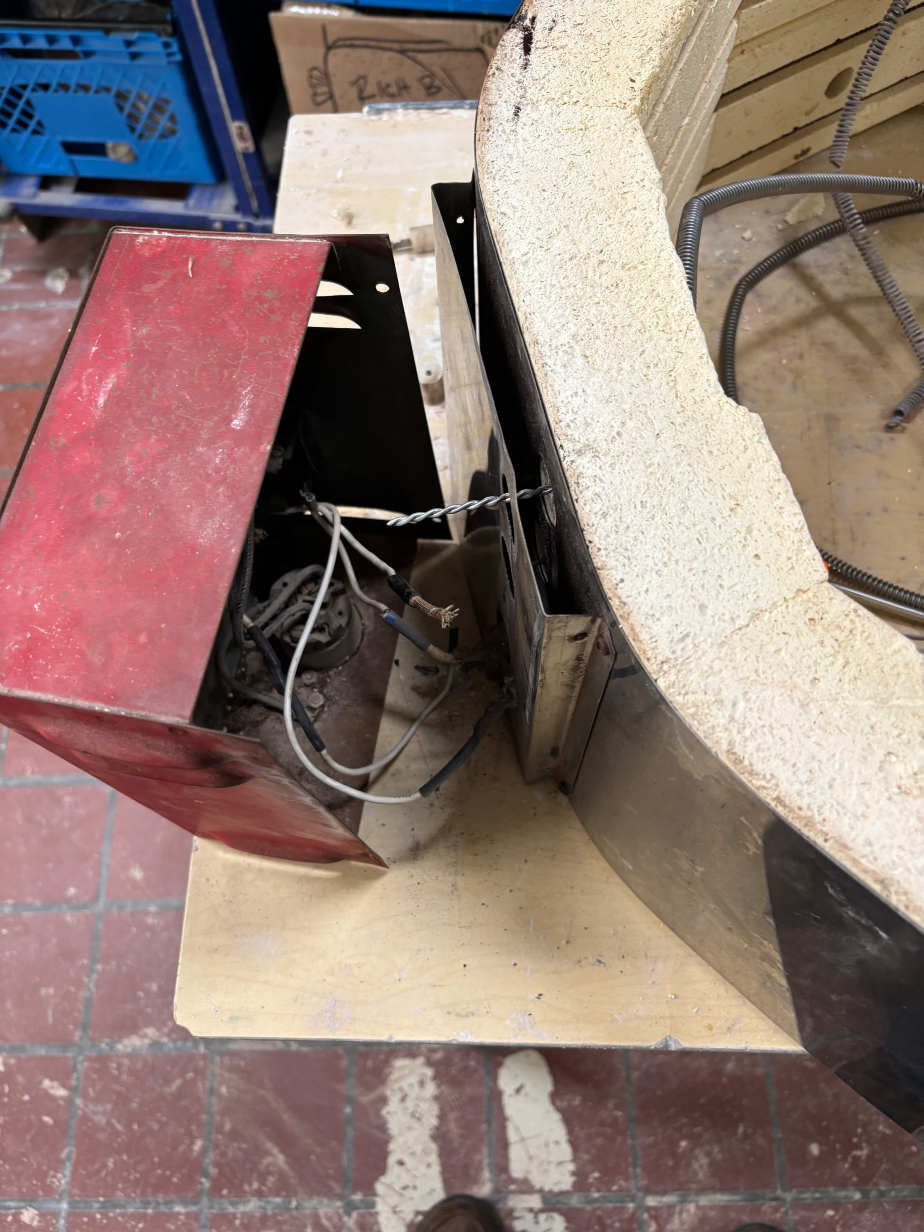 The bisque kiln has brand new coils and is back together and happy. Thanks to Ed Hill for the assistance.