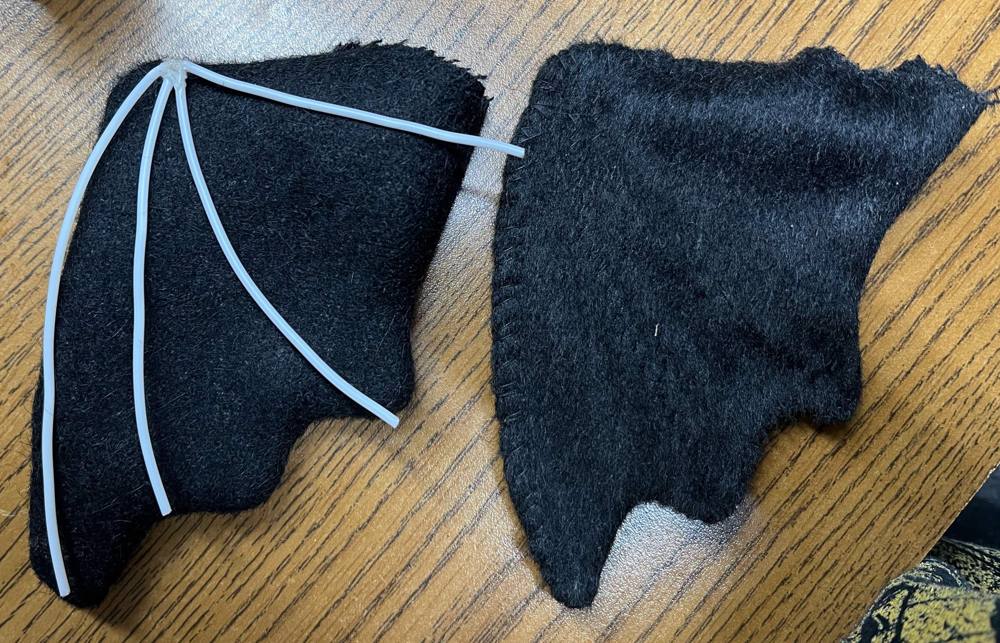 The pattern calls for stuffed wings, but I thought they looked silly, so I created skeletons from 3D print filament I found in the trash: