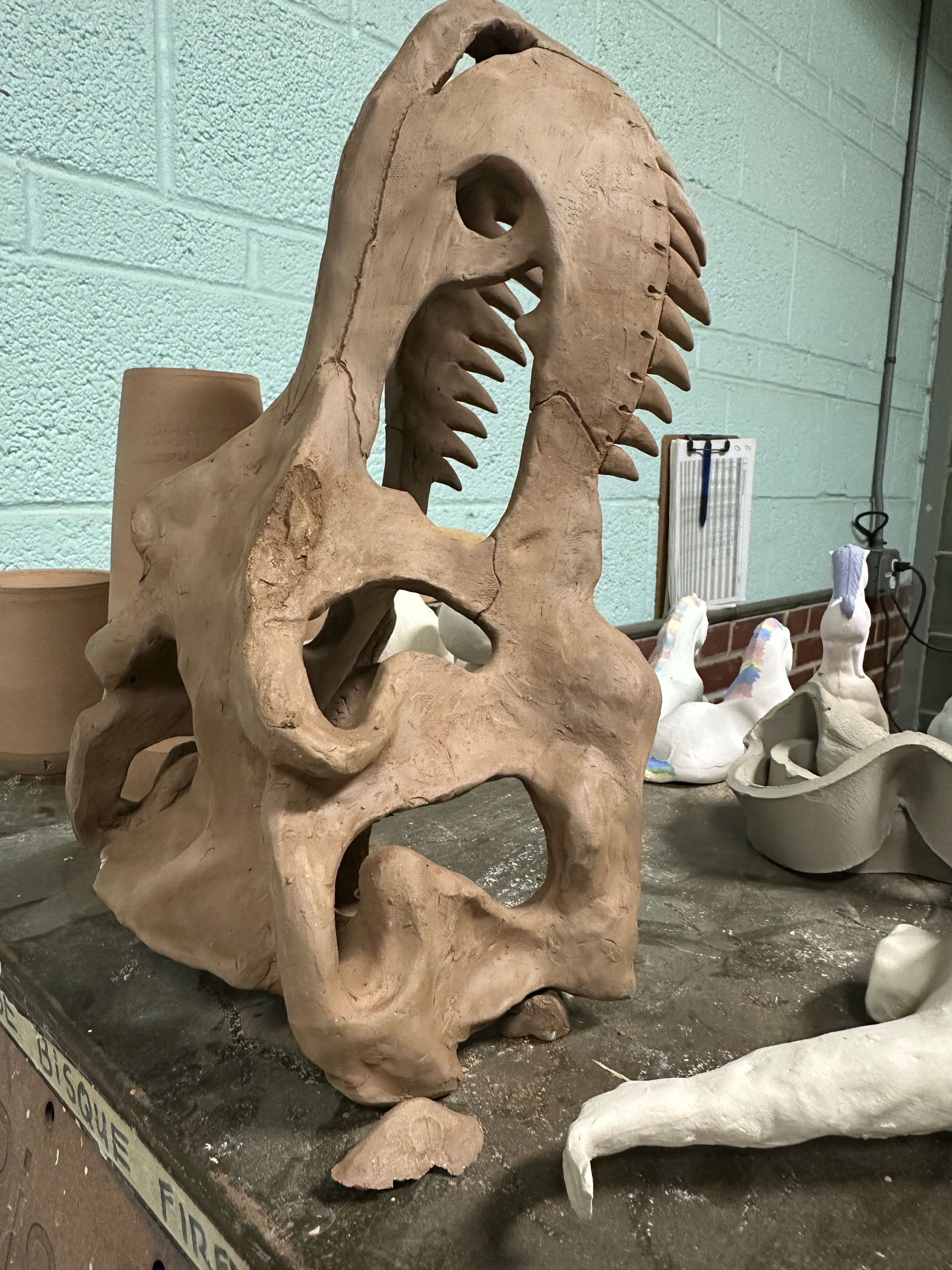The dinosaur has a piece that has popped off it. I don’t know why- but I see it and assume the maker will want to repair before it is bisque fired. So will hold off on putting it in the kiln.