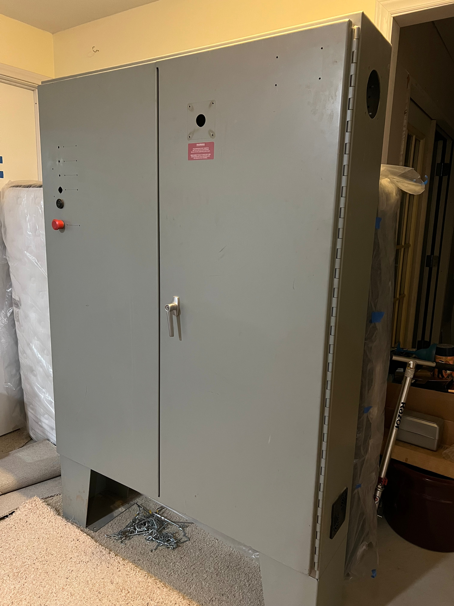 This is a large, two-door, freestanding control cabinet (sans controls). The internal mounting plate was replaced with a sheet of aluminum pegboard. It has been housed indoors in a smoke free home for the last 20+ years and has been used for all types of tool/toy storage and security. There are a few holes in it from its previous duty as a control system enclosure but it is super sturdy. Cabinet is 10” deep, 4’ wide x 5’ tall and is mounted on 1’ tall legs. It is very heavy. If interested I can send more pics. Price is $300 + $50 delivery to Wichita area.