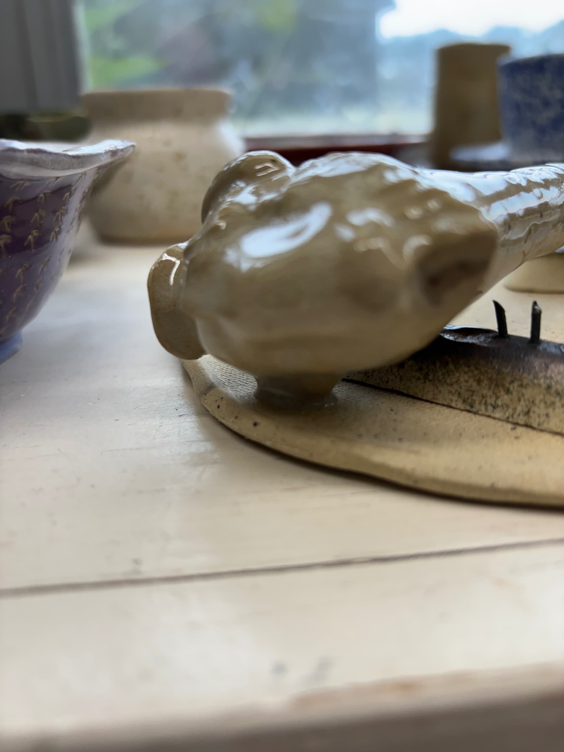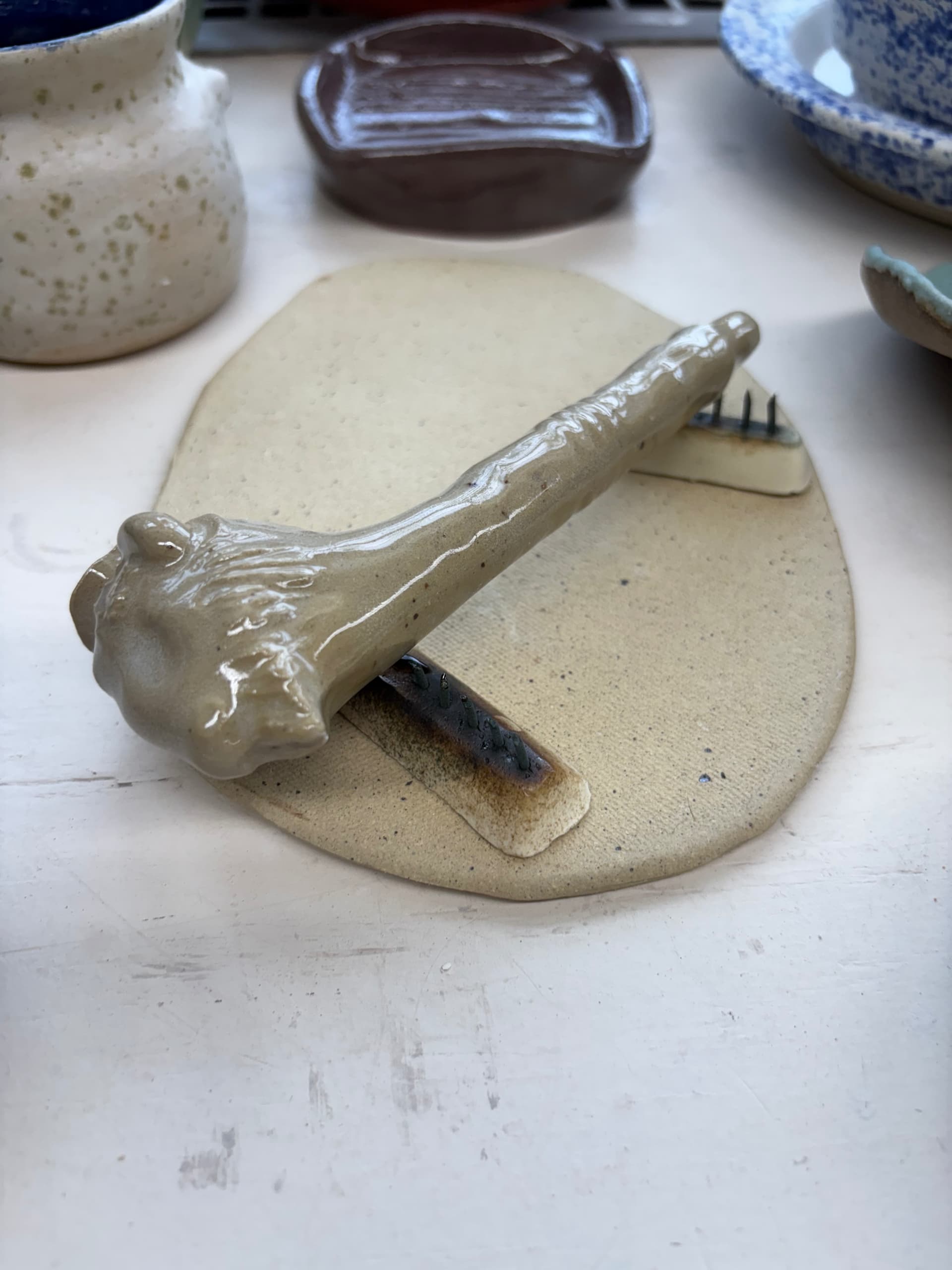 The lion pipe (to acco use only) fell over in the kiln and stuck to the cookie