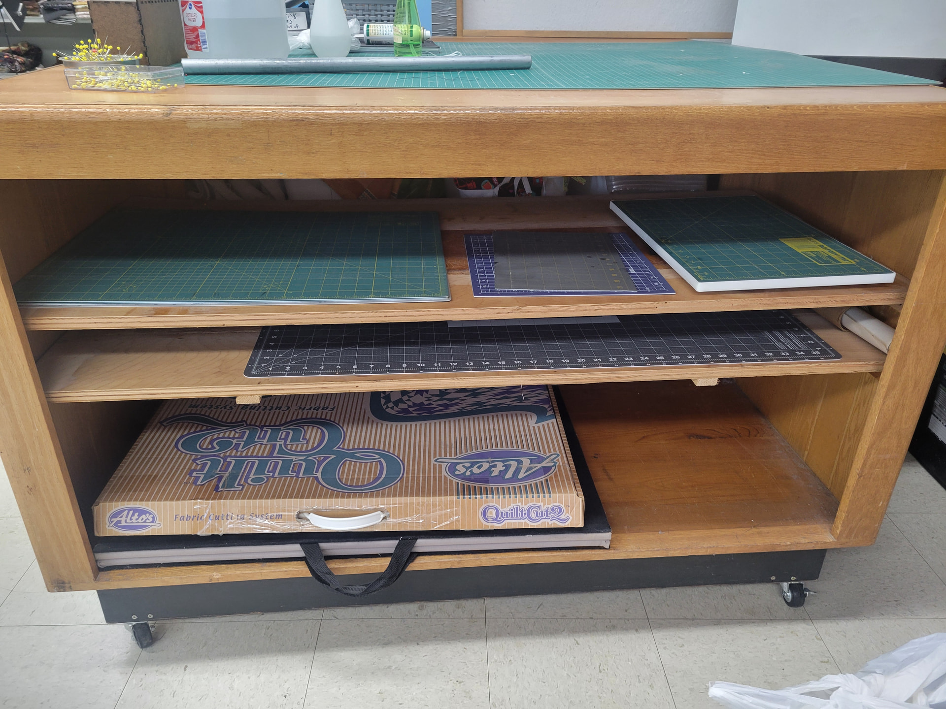 It has begun. Does any if this belong to you? If not, it will be reshelved. The cutting tables are being reset for their original function. This is a work in process and is not quite done yet. Work will continue 2/28. If you have any projects “stashed”, now is the time to take them home.