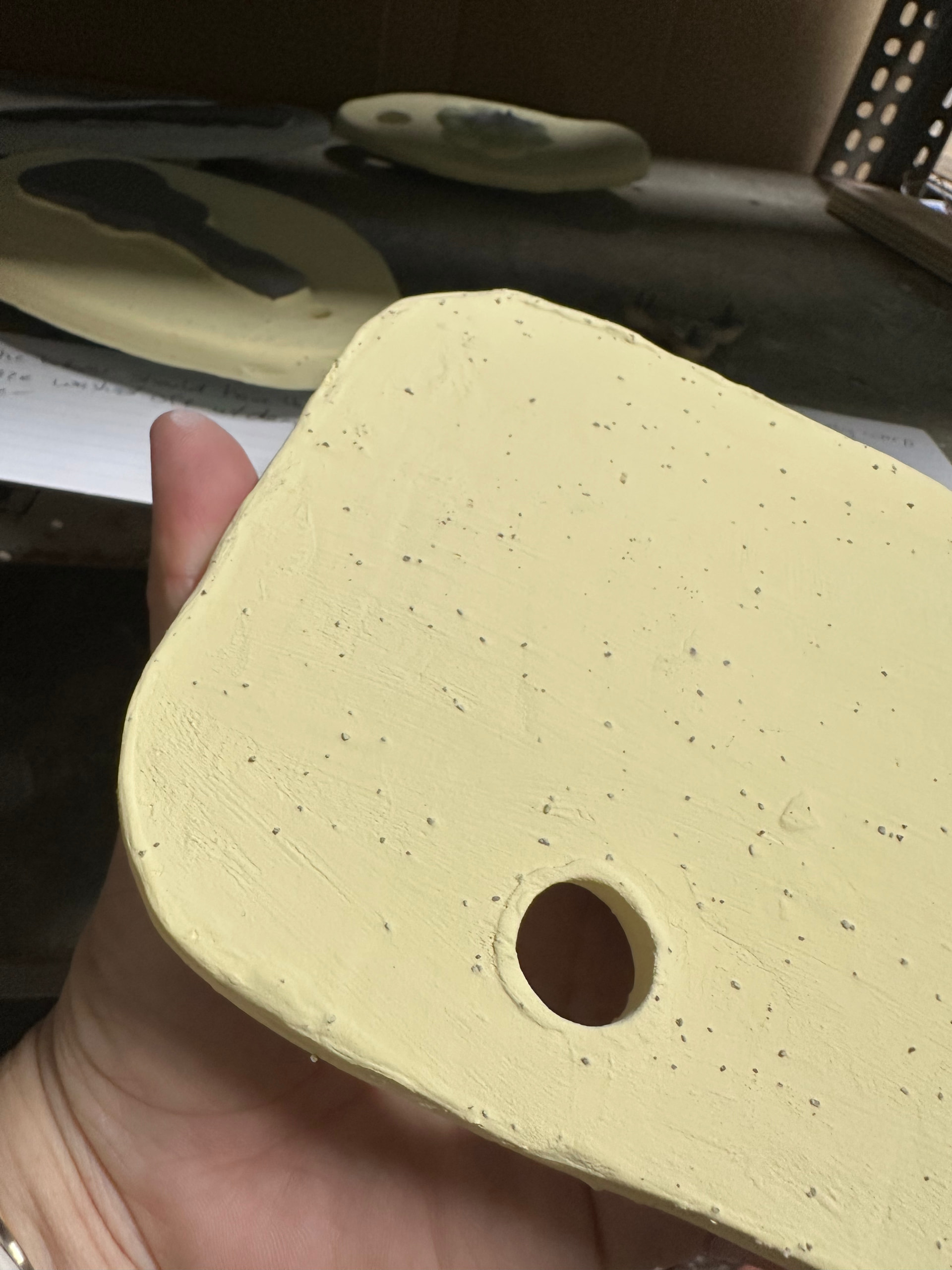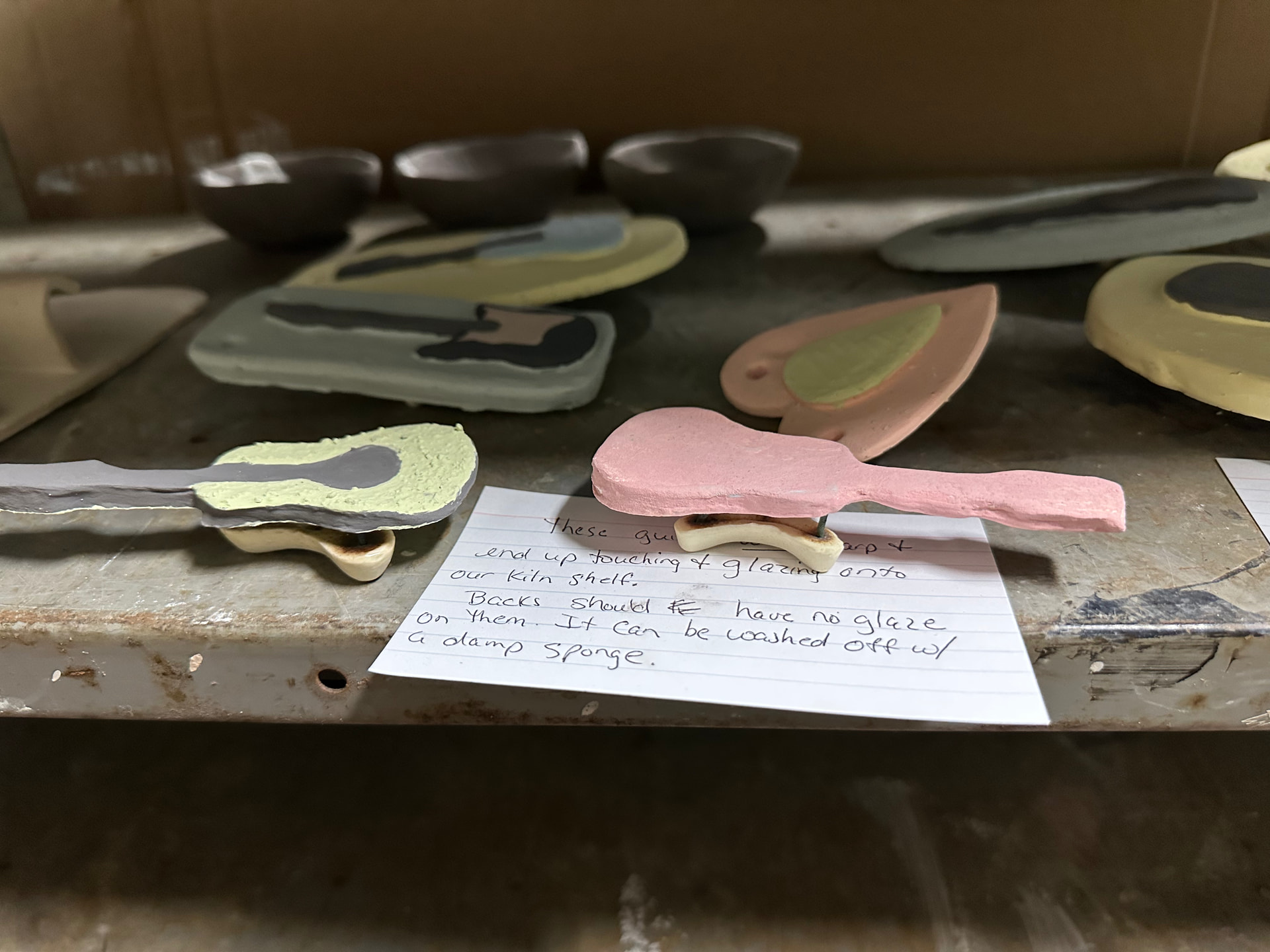 These guitar necks will almost for sure warp down enough they will end up melted to the kiln shelf with this little little stilt supporting only the body. We really can’t fire anything we believe will stick to the kiln shelves.