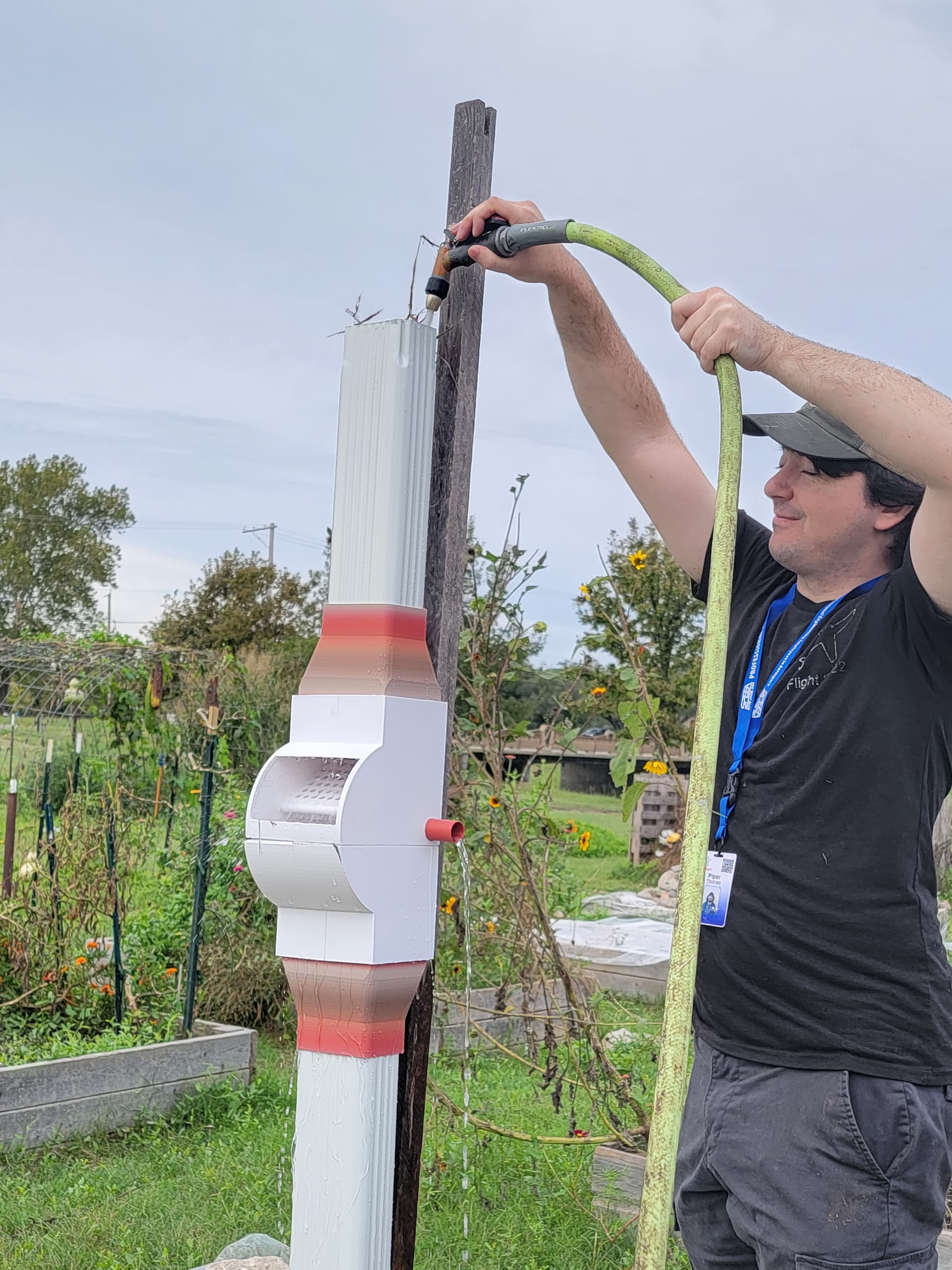 Piper testing his prototype for the water diverter, which will be used to divert water from the gutters into our rain barrels!
